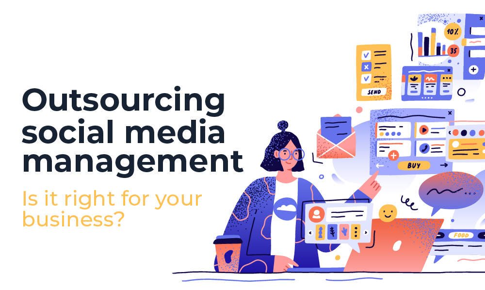 Illustration of a woman working on her laptop. There are social media related figures floating around. It reads "Outsourcing social media management. Is it right for your business?"