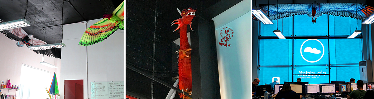 The new creative studio has been specifically designed for creative work. It has two audiovisual studios (one is still under construction) for photography, video and audio recording. It also has a production room for physical mockups, a breakout area for chilling, glass whiteboards, dim lighting, a flock of enormous birds and a watchful dragon.